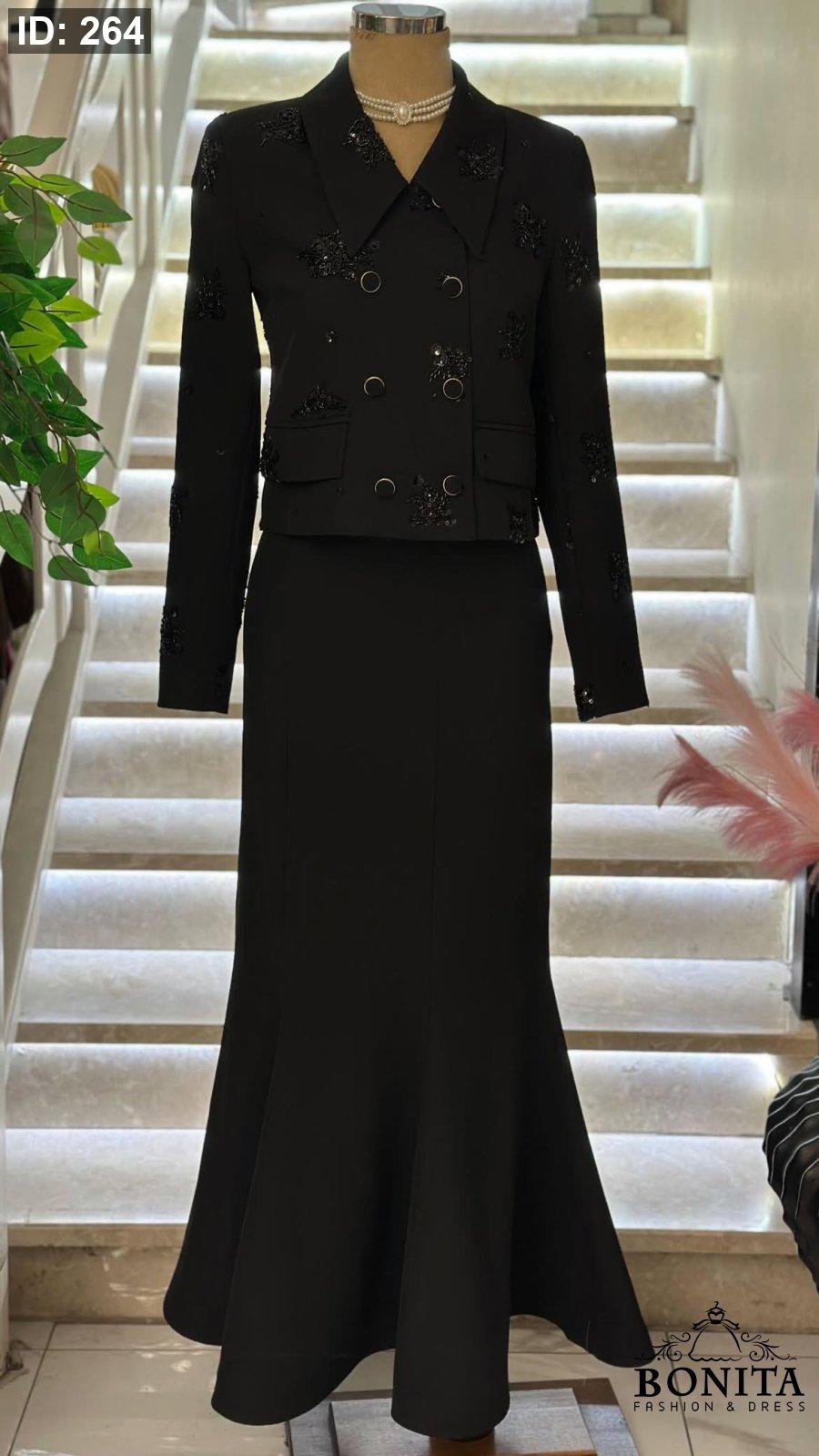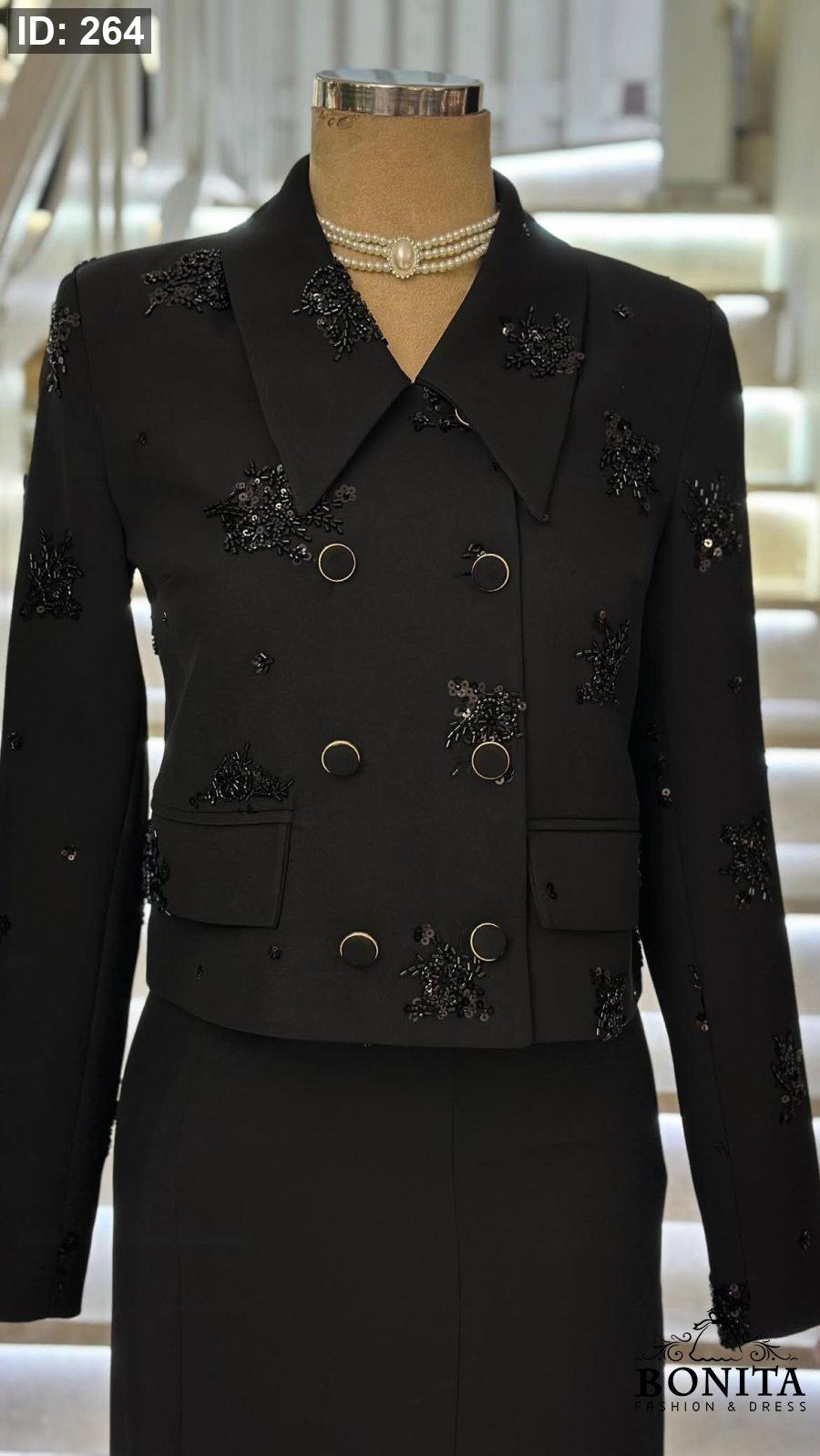 طقم اسود رسمي تنورة مع جكيت فخم وكلاسيكي /نقش زهرة مطرزة بخرز بارز مش مجرد خطوط🖤